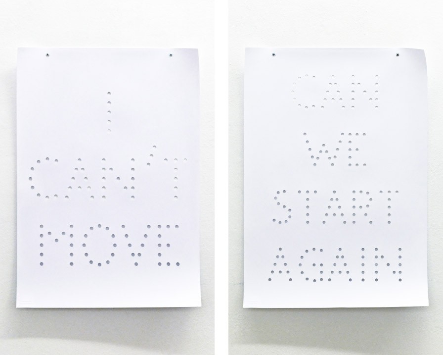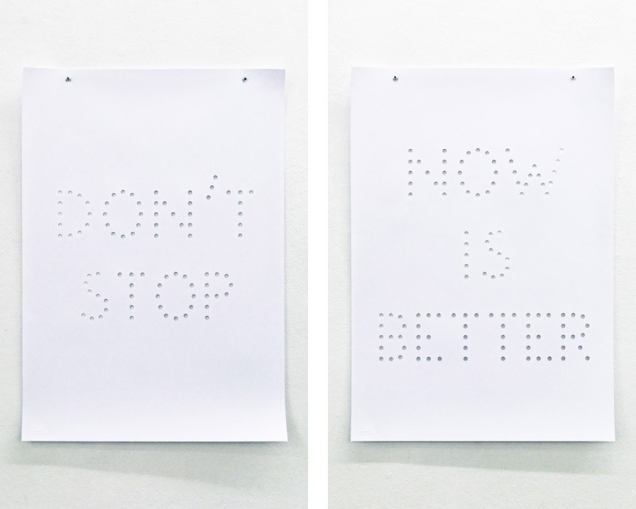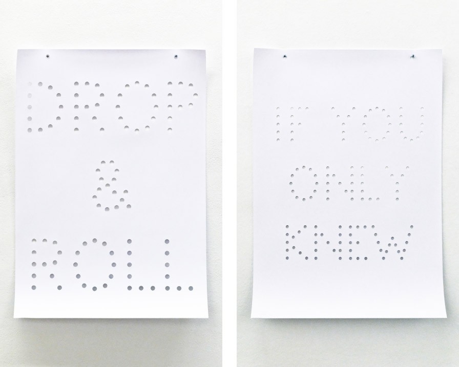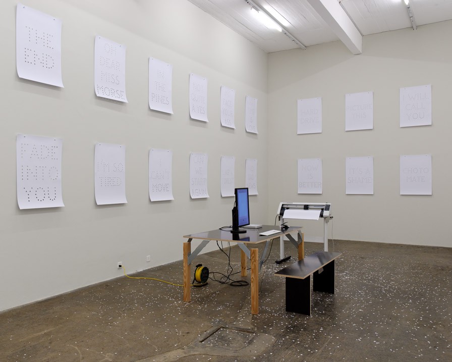 In 2005, together with Jonathan Hares, a pair of drilled posters were made as a contribution to The Free Library, curated by Mark Owens. This prompted the exploration of possible methods of mechanised production. Using a standard CNC plotter, a rotated LCD display, an Apple TV, and a software interface, Empty Words cuts each dot of the poster in sequence at a controlled speed. Similar to a Linotype machine, the resulting device became a tool for the production of text works, used by both ourselves and the general public.